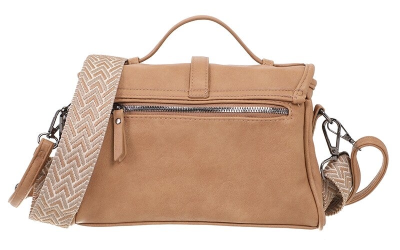 Onder de flap vind je een slim ingedeeld hoofdvak met twee open vakken, gescheiden door een centraal ritsvak. Daarnaast is er een extra opbergvakje en een veilig ritsvak aan de achterkant – ideaal voor je telefoon. Zo heeft alles een eigen, logische plek.