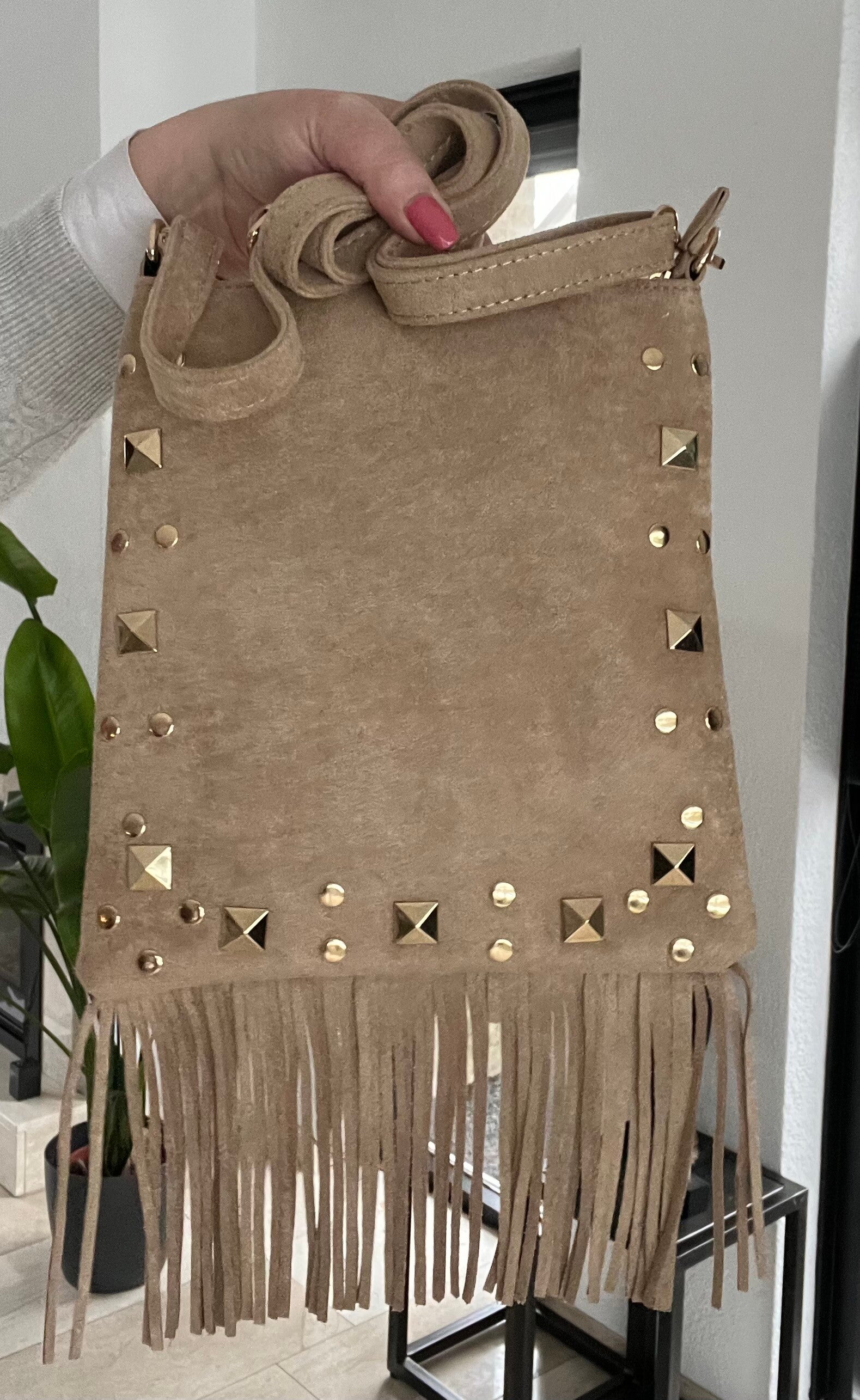 Deze trendy schoudertas met suède look is een echte eyecatcher. De speelse franjes en goudkleurige studs geven de tas een bohemian-chique uitstraling, perfect voor dagelijks gebruik én festivals. Dankzij het lichte gewicht en de praktische indeling neem je al je essentials moeiteloos mee.