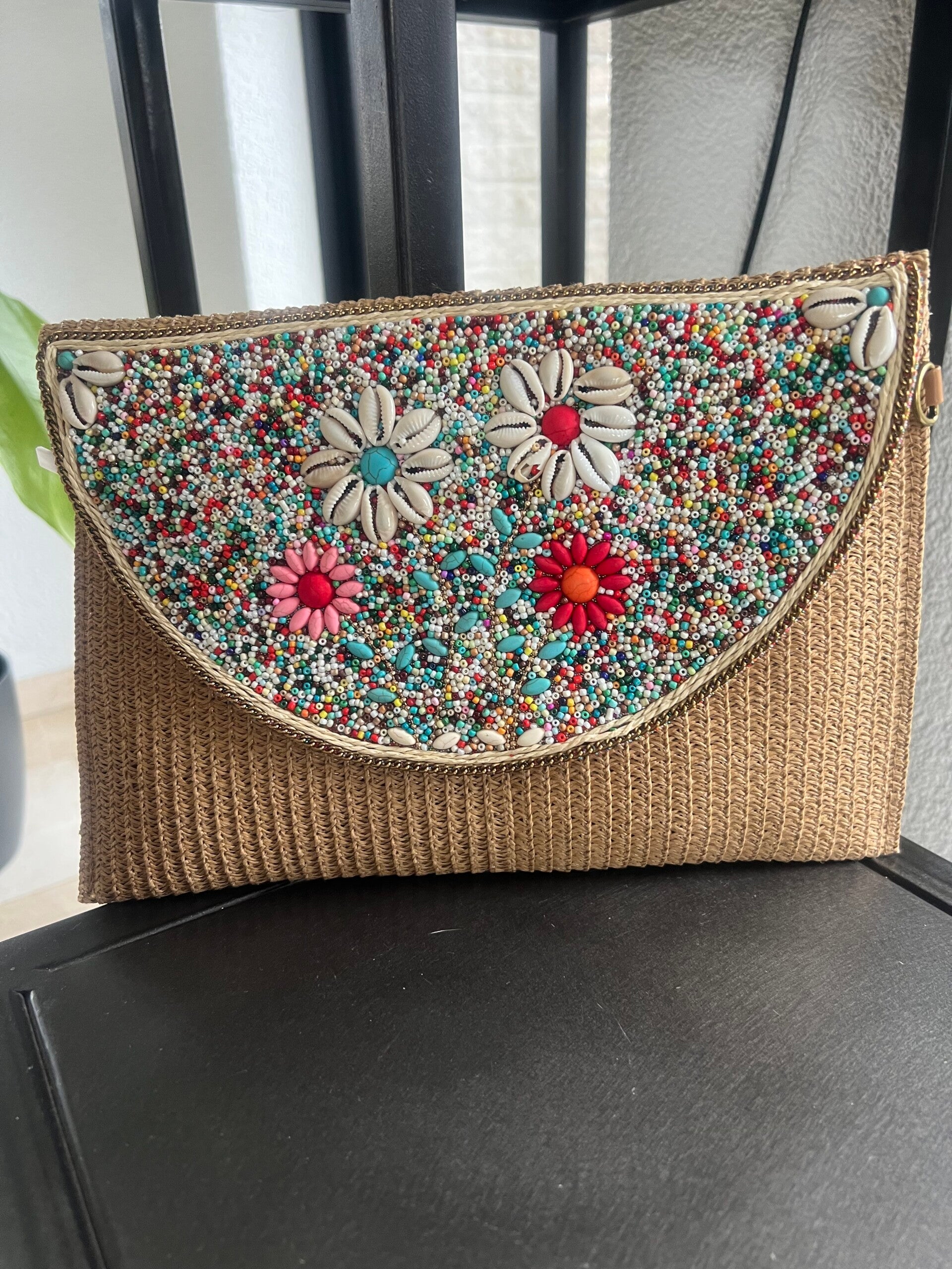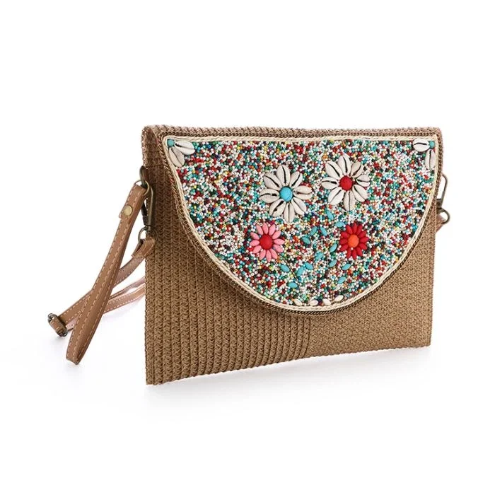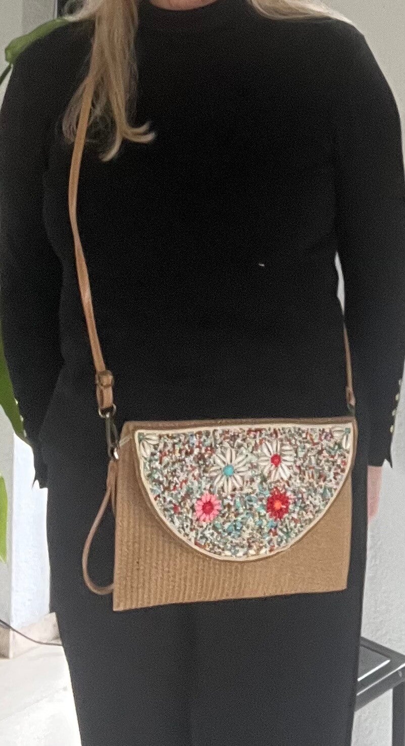 Dit stijlvolle mozaïek tasje is een unieke toevoeging aan elke outfit. Dit tasje is rijk gedecoreerd met kleurrijke kraaltjes en speelse details. Het opvallende motief en de levendige kleuren geven het tasje een vrolijke, bohemian uitstraling en maken elk exemplaar uniek.