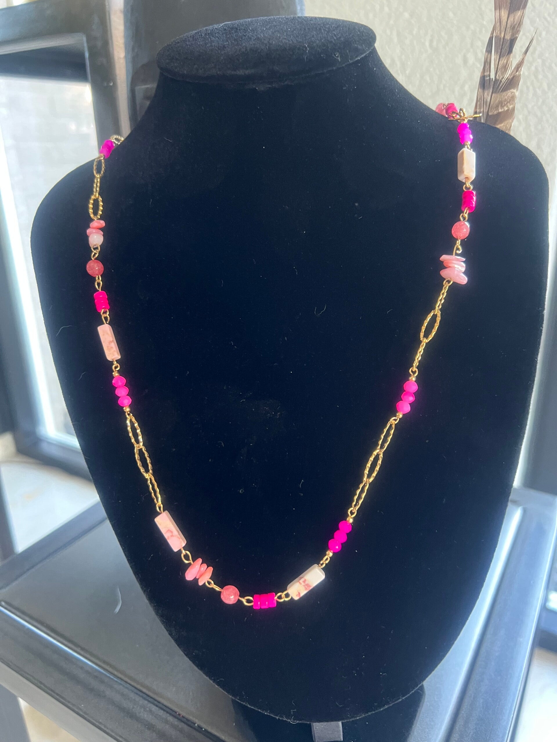Deze lange roze RVS ketting is een echte blikvanger met een speelse en vrouwelijke uitstraling. De combinatie van goudkleurige schakels met verschillende roze kralen in diverse vormen en tinten geeft de ketting een trendy en frisse look.