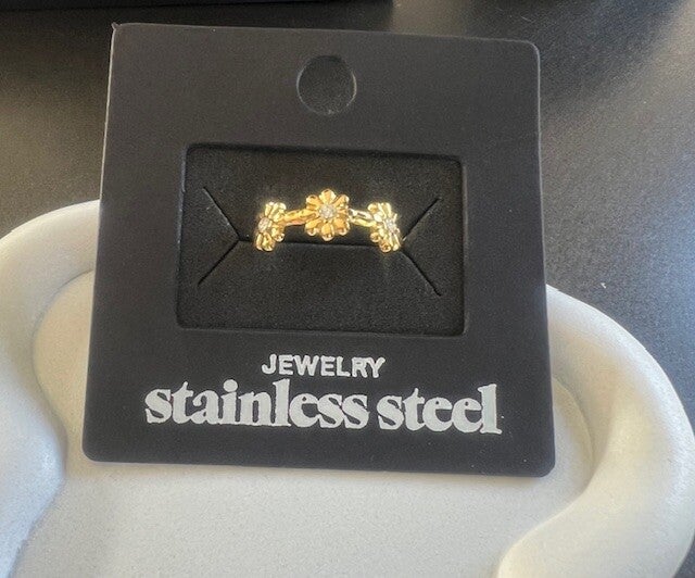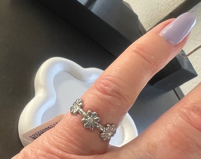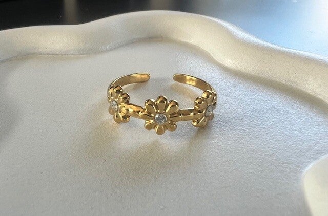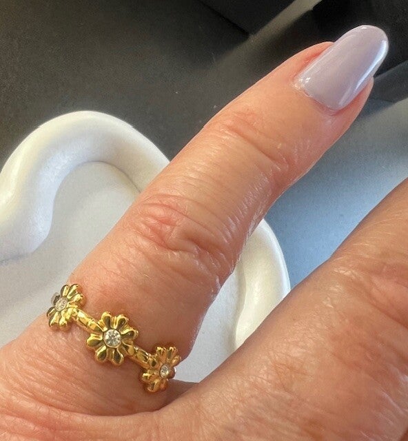 Deze minimalistische ring met bloemetjes is een subtiel en stijlvol sieraad dat perfect past bij elke outfit. Het verfijnde bloemmotief geeft een speelse, vrouwelijke touch zonder te overheersen, waardoor de ring ideaal is voor dagelijks gebruik of als aanvulling op andere sieraden.